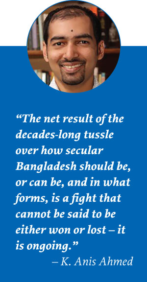 An effective means of accomplishing this task is to broaden the understanding of secularism at the state and societal levels. Conventional wisdom would have us believe that secularism thrives on a strict separation of religion and the state. Such idealistic notions have been vehemently discredited as religious precepts continue to hold sway in matters of statecraft. Modern manifestations of secularism focus on its influence in maintaining an equal distance between all religions without allowing one faith or belief system to dominate others. This is the model of secularism that was envisaged for Bangladesh. The government needs to skillfully engage in a balancing act that gives effect to the principles enshrined in the 1972 Constitution. For this purpose, Bangladesh will need to revert the vision of secularism that was espoused by its founding father. This can only be accomplished without any obstructions if all the stakeholders comprehend the essence of the secularist ideals that govern Bangladesh’s polity. No solution can be sought in the absence of a consensus on what the state’s commitment to secularism means for all religious communities in the country.![]()